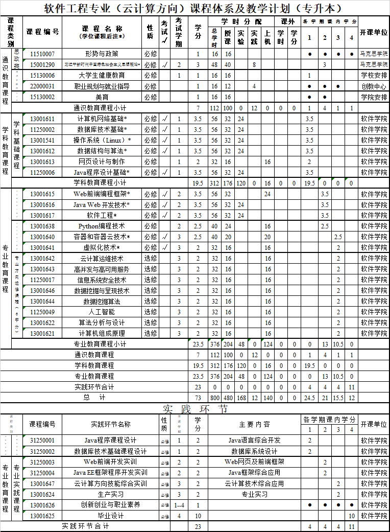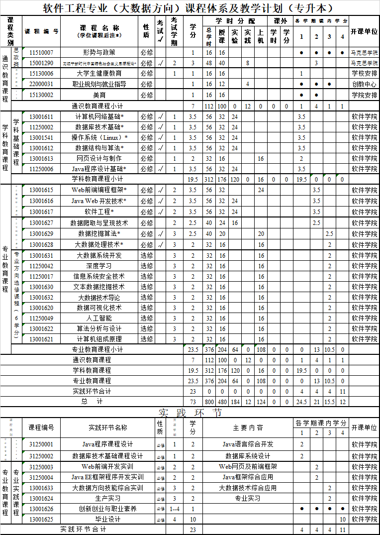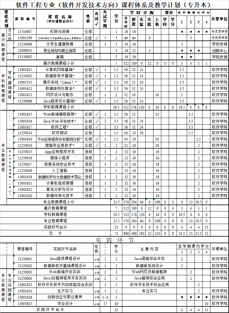 主要实践教学环节包括:Java程序课程设计、数据库技术基础课程设计、Web前端开发实训、Java EE框架程序开发实训、专业综合实训、生产实习、毕业设计。